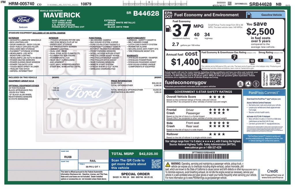 $3,967 off MSRP! 2025 White Metallic Ford Maverick Lariat AWD CVT 2.5L I-4 Hybrid