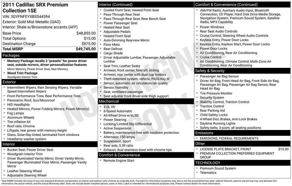 NAVIGATION SYSTEM, POWER SUNROOF, LEATHER, REARVIEW CAMERA SYST, BLUETOOTH HANDS FREE, CRUISE CONTROL, HTD/COOLED SEAT PKG, HTD MIRRORS, POWER LIFTGATE, PREMIUM WHEELS/TIRES, PARKING SENSORS, POWER ADJUSTABLE PEDALS, PREMIUM AUDIO, REMOTE START, REAR HEATED SEATS, MULTI ZONE CLIMATE CONTROL, KEYLESS ENTRY, PREMIUM COLLECTION PREFERRED EQUIPMENT GROUP, ACCIDENT FREE CARFAX, AWD. Gold Mist Metallic 2011 Cadillac SRX Premium AWD 6-Speed Automatic 3.0L V6 SIDI DOHC VVT