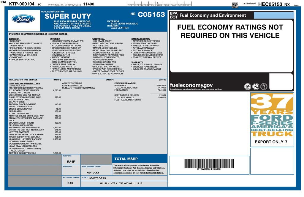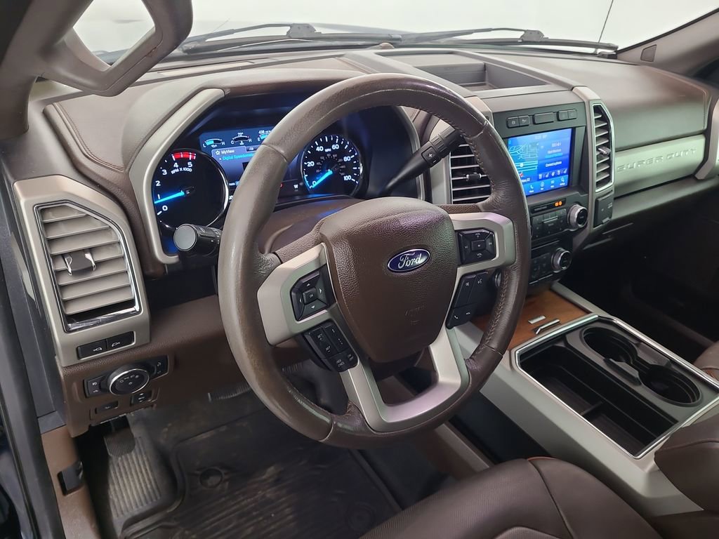 Priced below KBB Fair Purchase Price! ADAPTIVE CRUISE CONTROL, BLIND SPOT MONITORING SYSTEM, LANE MANAGEMENT SYSTEM, COLLISION WARNING SYSTEM, NAVIGATION SYSTEM, TWIN PANEL MOONROOF, LEATHER, REARVIEW CAMERA SYST, BLUETOOTH HANDS FREE, DUAL FACTORY AIR, HTD/COOLED SEAT PKG, HTD MIRRORS, PREMIUM WHEELS/TIRES, PARKING SENSORS, POWER SLIDING REAR WINDOW, POWER FOLDING SIDE MIRRORS, POWER RUNNING BOARDS, SYNC 3, SPRAY IN BED LINER, TONNEAU COVER, KEYLESS ENTRY, TOW TECHNOLOGY BUNDLE, ADAPTIVE STEERING, ULTIMATE TRAILE TOW CAMERA, KING RANCH ULTIMATE PACKAGE, UPFITTER SWITCHES, 5TH WHEEL HITCH PREP PACKAGE, 4WD. Blue Jeans Metallic 2017 Ford F-350SD King Ranch 4WD TorqShift 6-Speed Automatic Power Stroke 6.7L V8 DI 32V OHV Turbodiesel