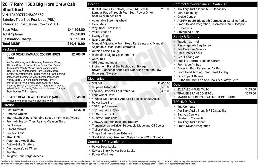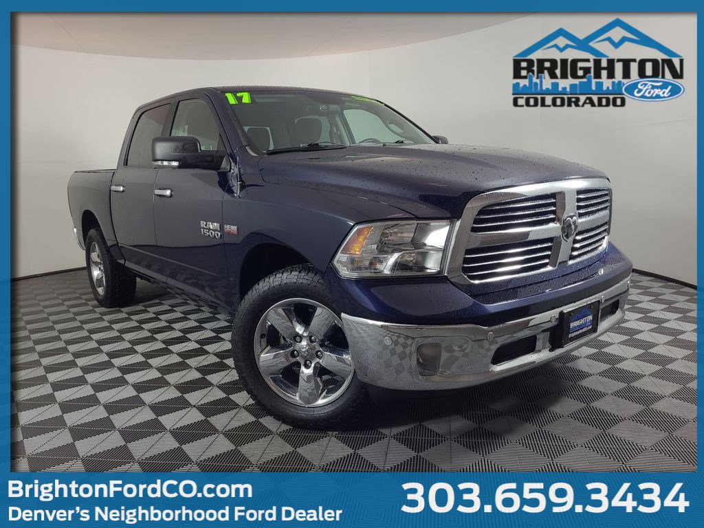 ONE OWNER, REARVIEW CAMERA SYST, BLUETOOTH HANDS FREE, CRUISE CONTROL, HTD MIRRORS, HEATED SEAT PKG, PREMIUM WHEELS/TIRES, PARKING SENSORS, REMOTE START, KEYLESS ENTRY, TRAILER BRAKE CONTROLLER, CLASS IV RECEIVER HITCH, NAVIGATION CAPABLE, ACCIDENT FREE CARFAX. True Blue Pearlcoat 2017 Ram 1500 Big Horn 4WD 8-Speed Automatic HEMI 5.7L V8 Multi Displacement VVT