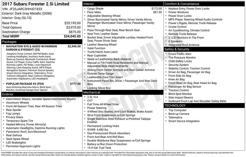 COLLISION WARNING SYSTEM, POWER SUNROOF, LEATHER, REARVIEW CAMERA SYST, BLUETOOTH HANDS FREE, CRUISE CONTROL, HTD MIRRORS, HEATED SEAT PKG, POWER LIFTGATE, PREMIUM AUDIO, ALL WHEEL DRIVE, KEYLESS ENTRY, EYESIGHT PACKAGE, HARMAN KARDON SOUND SYSTEM, POPULAR PACKAGE #2, PERIMETER ALARM. Dark Gray Metallic 2017 Subaru Forester 2.5i Limited AWD Lineartronic CVT 2.5L 4-Cylinder DOHC 16V VVT