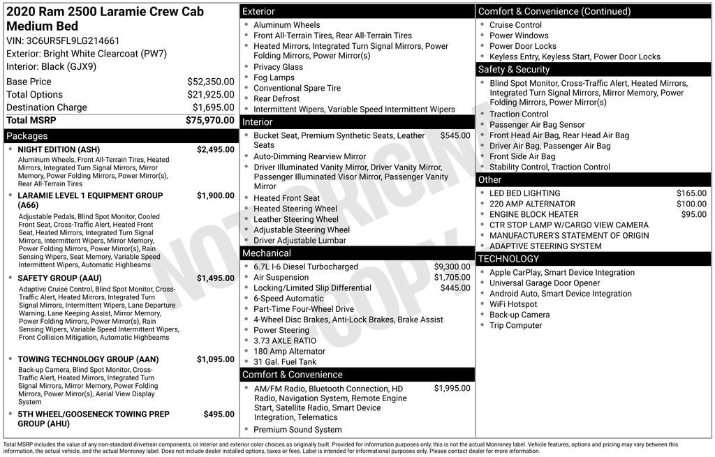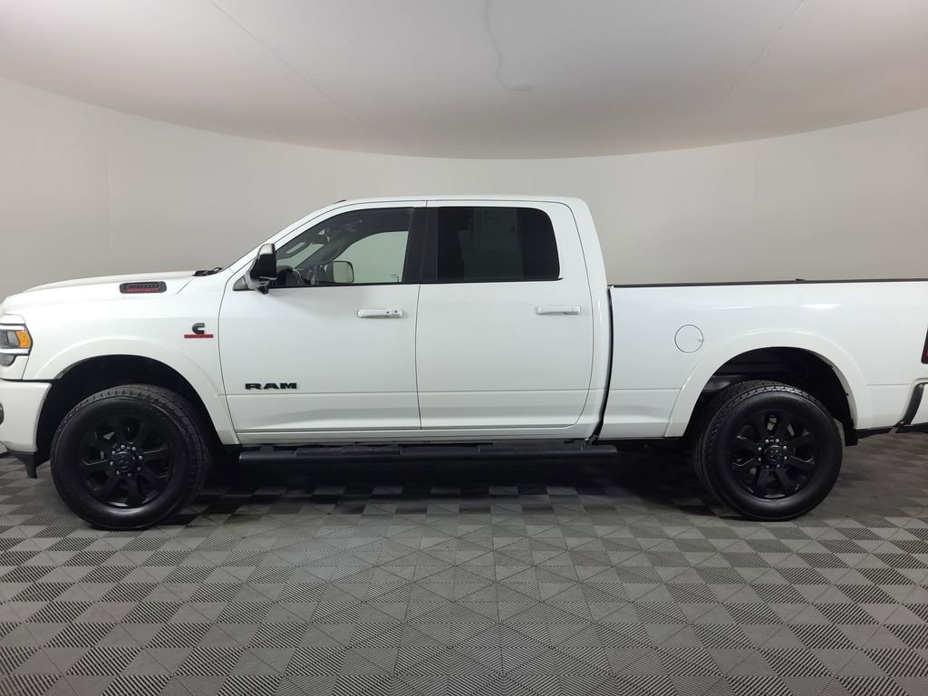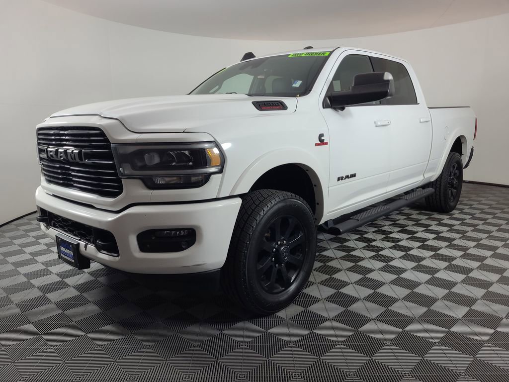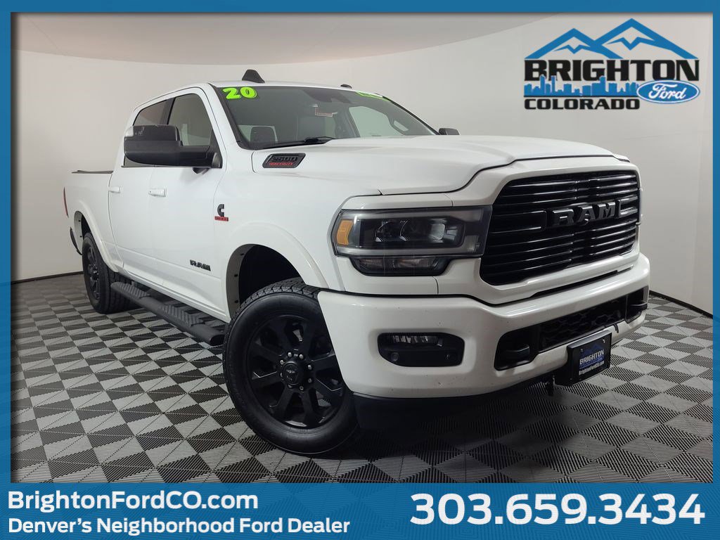 ADAPTIVE CRUISE CONTROL, BLIND SPOT MONITORING SYSTEM, COLLISION WARNING SYSTEM, ONE OWNER, LEATHER, REARVIEW CAMERA SYST, DUAL FACTORY AIR, HTD/COOLED SEAT PKG, PREMIUM WHEELS/TIRES, POWER ADJUSTABLE PEDALS, PREMIUM AUDIO, POWER FOLDING SIDE MIRRORS, REMOTE START, TOWING TECHNOLOGY PACKAGE, CENTER HIGH MOUNT STOP LAMP with CARGO VIEW CAMERA, SURROUND VIEW CAMERA SYSTEM, TRAILER REVERSE GUIDANCE, SAFETY GROUP, PROTECTION GROUP, TRANSFER CASE SKID PLATE SHIELD, 5TH WHEEL-GOOSENECK TOWING PREP GROUP, NIGHT EDITION, LEVEL 1 EQUIPMENT GROUP, REMOTE TAILGATE RELEASE, LED BED LIGHTING, ENGINE BLOCK HEATER, ACCIDENT FREE CARFAX. Bright White Clearcoat 2020 Ram 2500 Laramie 4WD 6-Speed Automatic Cummins 6.7L I6 Turbodiesel