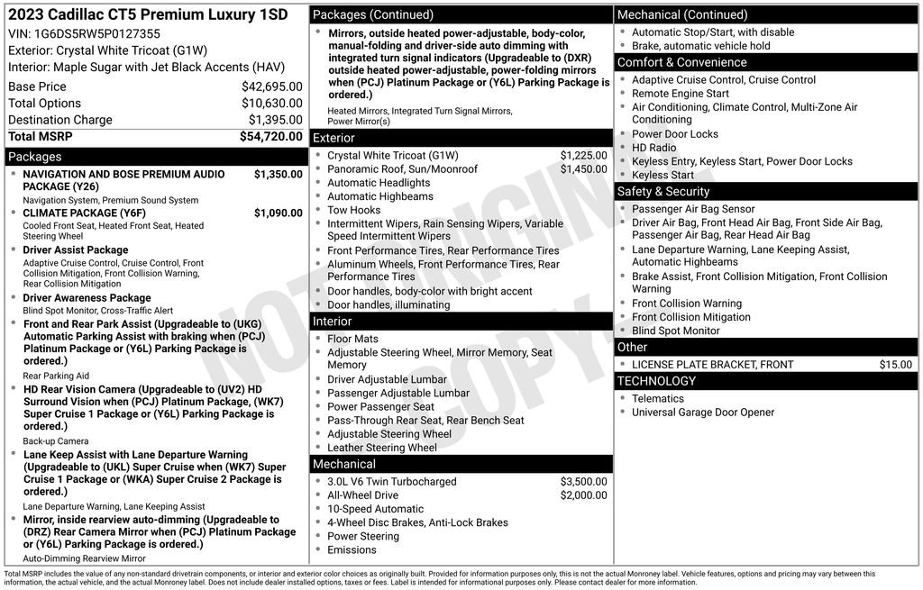 Priced below KBB Fair Purchase Price! ADAPTIVE CRUISE CONTROL, BLIND SPOT MONITORING SYSTEM, LANE MANAGEMENT SYSTEM, COLLISION WARNING SYSTEM, NAVIGATION SYSTEM, ONE OWNER, POWER SUNROOF, LEATHER, REARVIEW CAMERA SYST, BLUETOOTH HANDS FREE, HTD/COOLED SEAT PKG, HEATED STEERING WHEEL, HTD MIRRORS, PREMIUM WHEELS/TIRES, PARKING SENSORS, PREMIUM AUDIO, REMOTE START, ALL WHEEL DRIVE, CLIMATE PACKAGE, ACCIDENT FREE CARFAX. Crystal White Tricoat 2023 Cadillac CT5 Premium Luxury AWD 10-Speed Automatic 3.0L V6