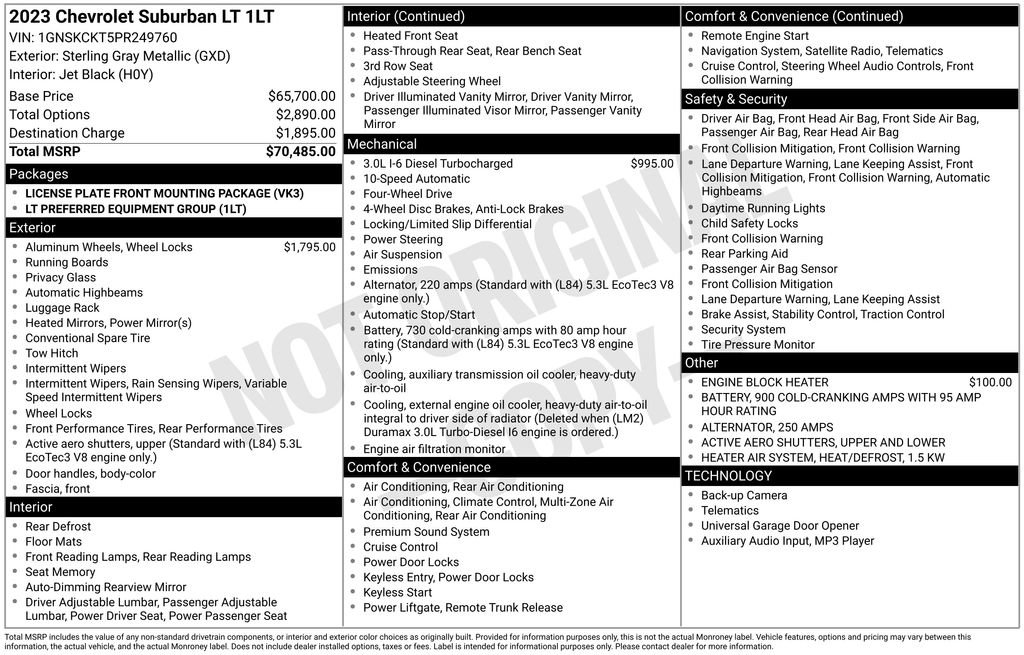 LANE MANAGEMENT SYSTEM, COLLISION WARNING SYSTEM, ONE OWNER, LEATHER, REARVIEW CAMERA SYST, BLUETOOTH HANDS FREE, CRUISE CONTROL, HTD MIRRORS, HEATED SEAT PKG, POWER LIFTGATE, PREMIUM WHEELS/TIRES, PREMIUM AUDIO, REMOTE START, MULTI ZONE CLIMATE CONTROL, 3RD ROW SEATS, KEYLESS ENTRY, DIESEL, APPLE CARPLAY CAPABLE, ANDROID AUTO CAPABLE. Sterling Gray Metallic 2023 Chevrolet Suburban LT 4WD 10-Speed Automatic 3.0L I6