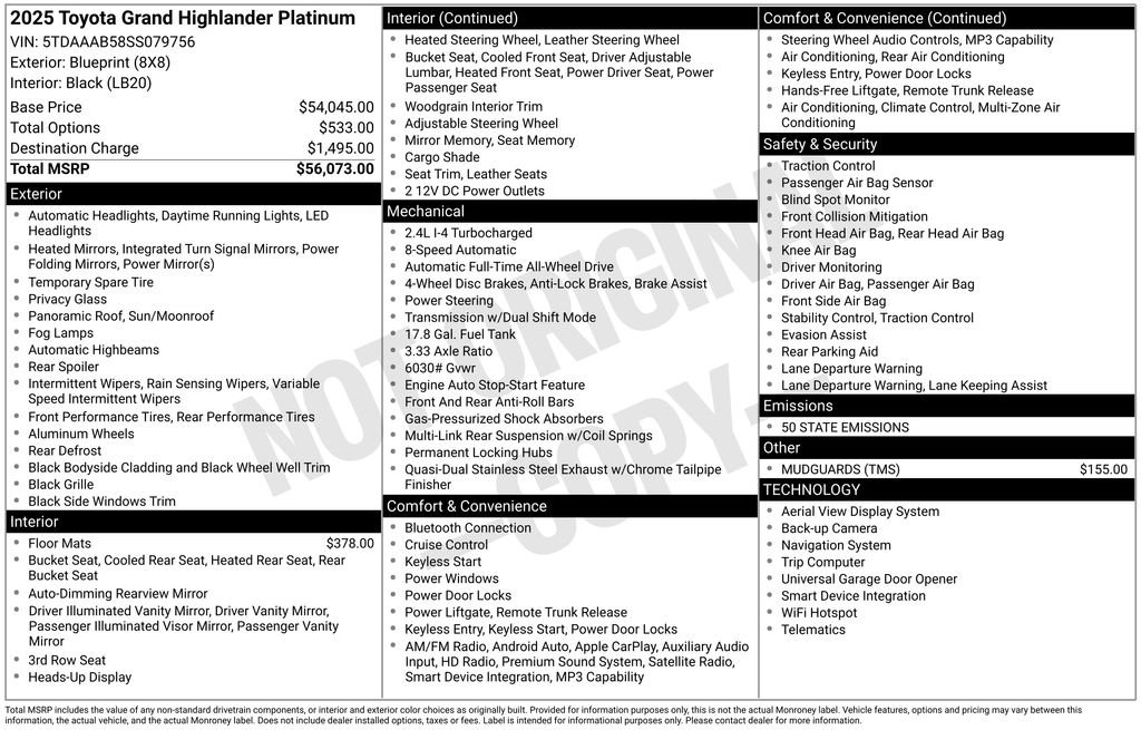 ADAPTIVE CRUISE CONTROL, BLIND SPOT MONITORING SYSTEM, LANE MANAGEMENT SYSTEM, COLLISION WARNING SYSTEM, ONE OWNER, PANORAMA ROOF, LEATHER, 360 CAMERA VIEW, REARVIEW CAMERA SYST, BLUETOOTH HANDS FREE, HTD/COOLED SEAT PKG, HEATED STEERING WHEEL, HTD MIRRORS, POWER LIFTGATE, PREMIUM WHEELS/TIRES, PARKING SENSORS, PREMIUM AUDIO, POWER FOLDING SIDE MIRRORS, MULTI ZONE CLIMATE CONTROL, 3RD ROW SEATS, ALL WHEEL DRIVE, KEYLESS ENTRY, APPLE CARPLAY CAPABLE, ANDROID AUTO CAPABLE, HTD/COOLED 2ND ROW SEATS, COLOR HEAD-UP DISPLAY, PANORAMIC VIEW MONITOR, NAVIGATION CAPABLE, ACCIDENT FREE CARFAX. Blueprint 2025 Toyota Grand Highlander Platinum AWD 8-Speed Automatic 2.4L 4-Cylinder